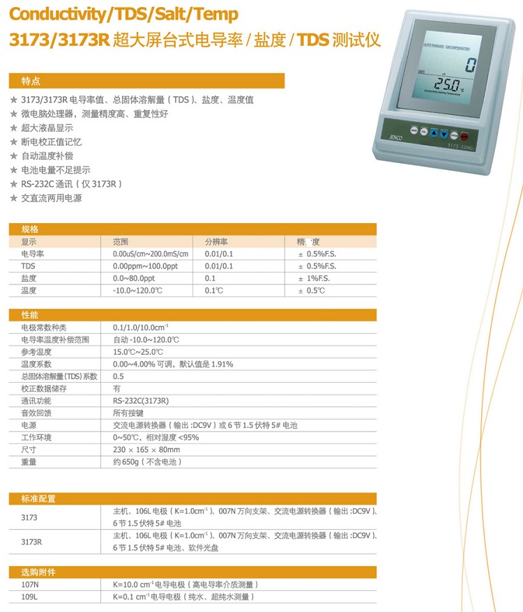 3173R型臺(tái)式屏電導(dǎo)/鹽度/TDS計(jì) JENCO/任氏總固體容量檢測(cè)儀