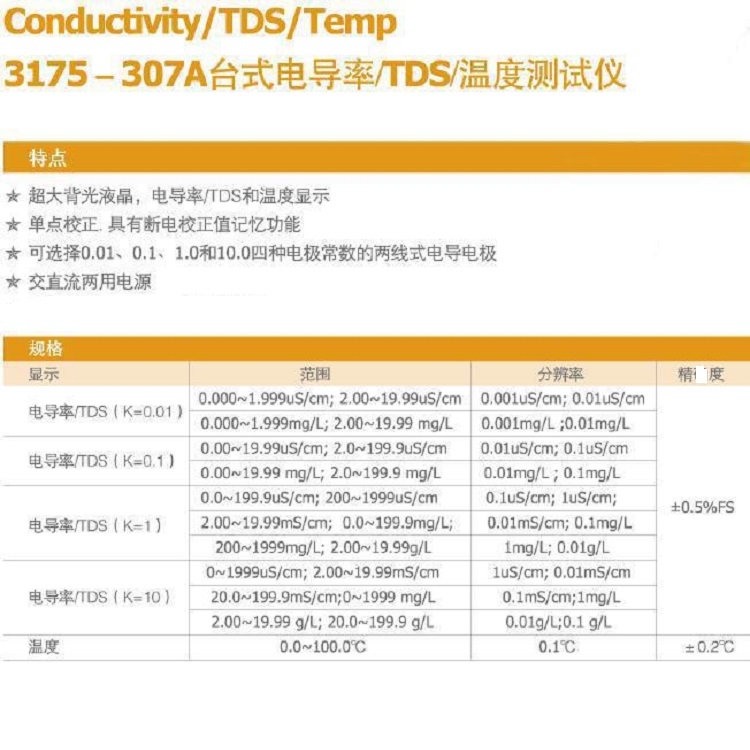 電導(dǎo)率/TDSK=1.00精度3±0.5% FS