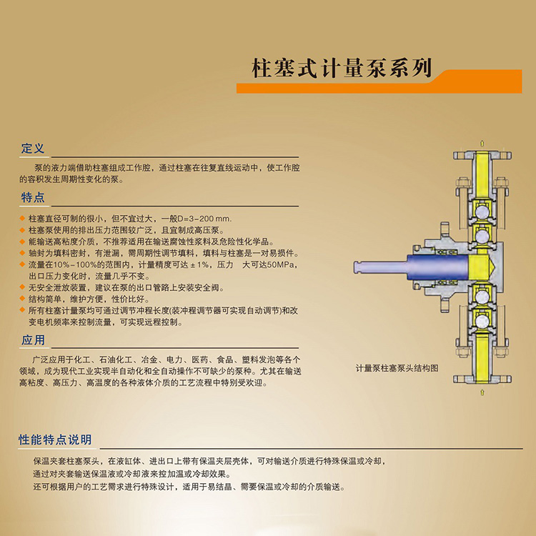 廣泛應用于化工、石油化工、冶金、電力、醫(yī)藥、食品、塑料發(fā)泡等各個領域,成為現(xiàn)代工業(yè)實現(xiàn)半自動化和全自動操作不可缺少的泵種。尤其在輸送高粘度、高壓力、高溫度的各種液體介質(zhì)的工藝流程中特別受歡迎。