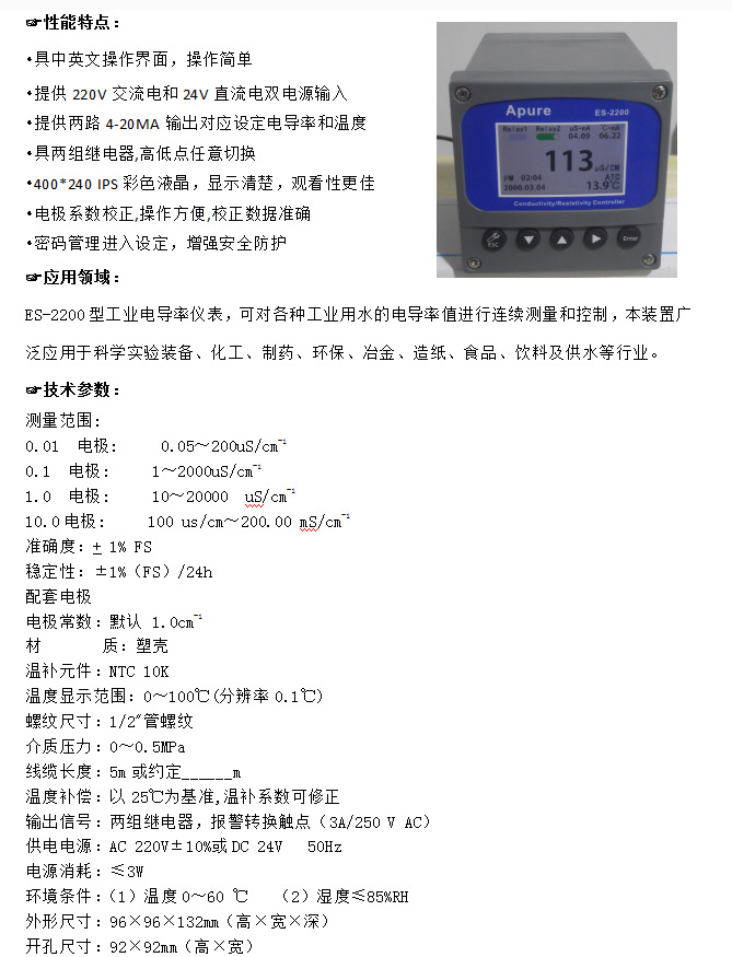 型號:愛普爾Apure工業(yè)在線電導率/電阻率儀ES-2200