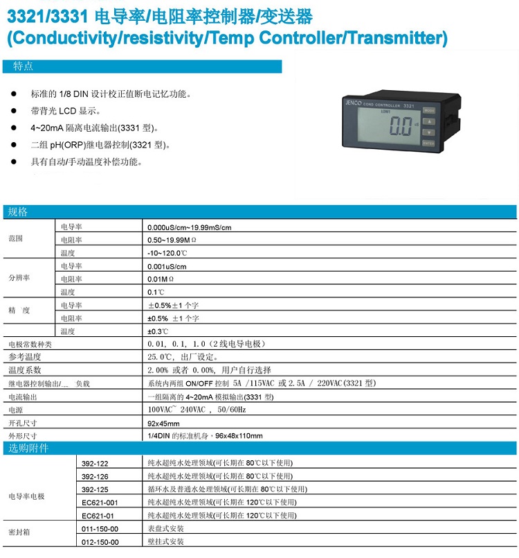 JENCO/任氏3321型在線電導(dǎo)率/電阻率/溫度變送器控制器(單機(jī))