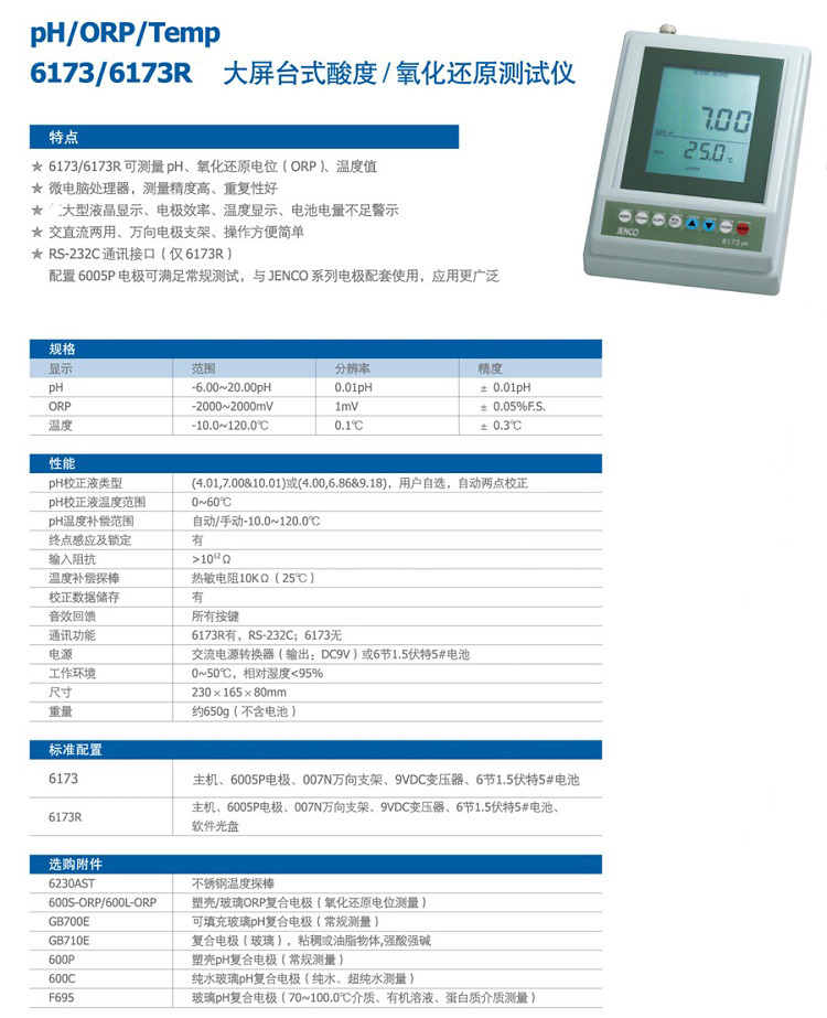 PH/ORP計6173 JENCO/任氏臺式電腦型便攜酸堿度計/mV/溫度計儀器