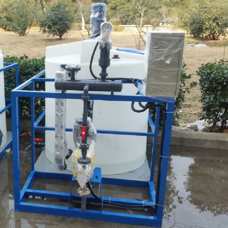 固體藥劑加入溶藥箱內(nèi).然后按比例加入工業(yè)水?dāng)嚢枞芙?,由?jì)量投加系統(tǒng)投加藥點(diǎn)。投加控制可采用手動(dòng)方式,也可依據(jù)上位系統(tǒng)輸出的控制信號(hào),進(jìn)行隨動(dòng)控制,自動(dòng)投加。具有以下特點(diǎn):