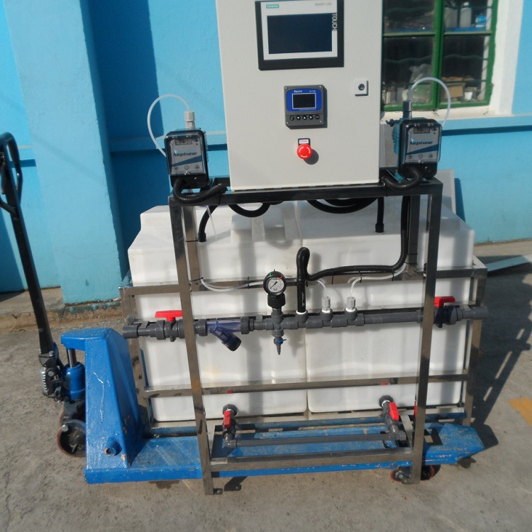 ?溶液可通過(guò)定量泵與進(jìn)水在線(xiàn)稀釋至使用濃度,并通過(guò)靜態(tài)混合器得到均勻溶液。