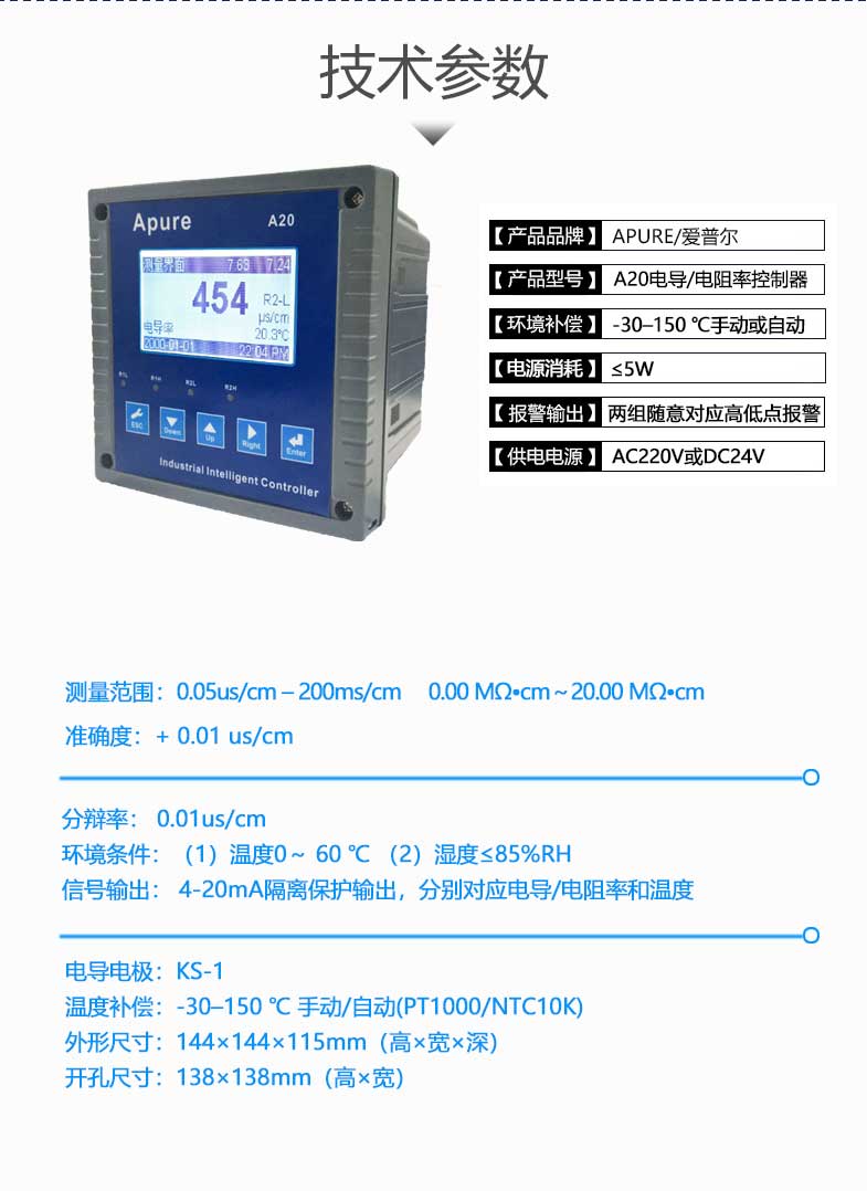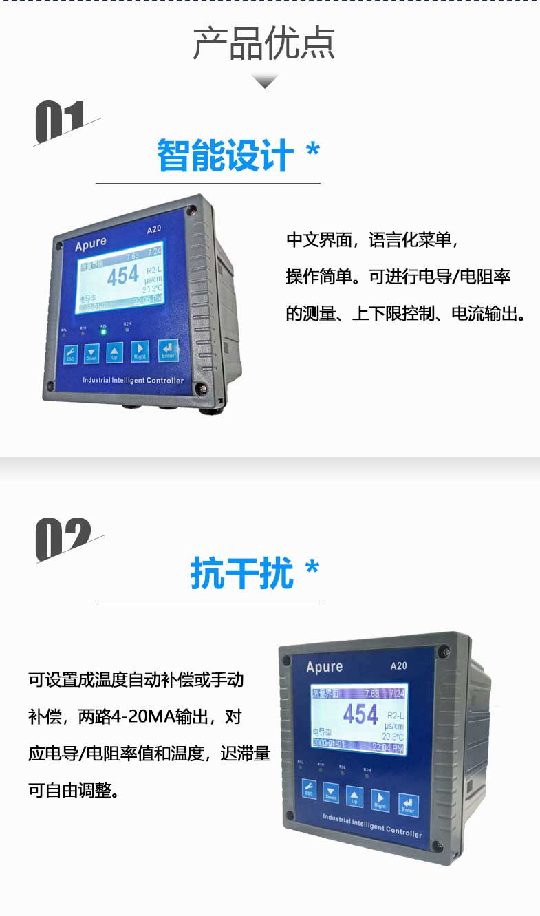 型號:Apure愛普爾電導(dǎo)率儀A20CD系列工業(yè)在線電導(dǎo)/電阻率控制器