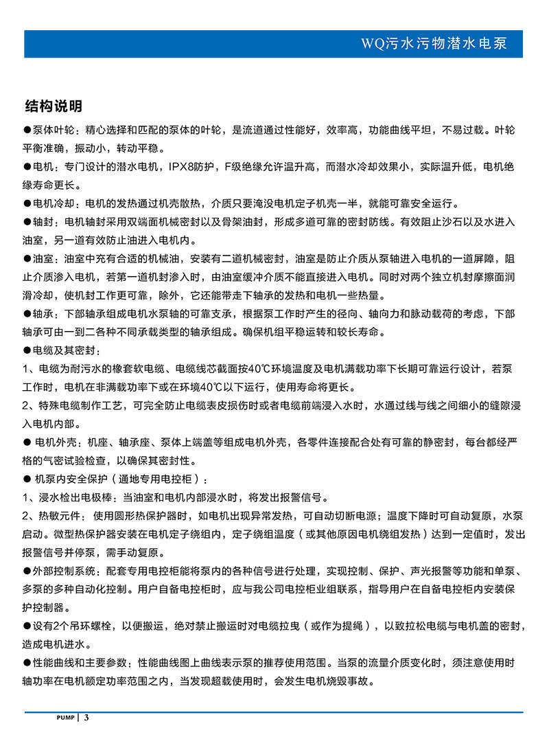 產(chǎn)品說明:南方WQ污水污物潛水電泵由電機與泵兩部分組成,兩者通過油室及機械密封組件隔開,分固定式自動耦合安裝和移動安裝。