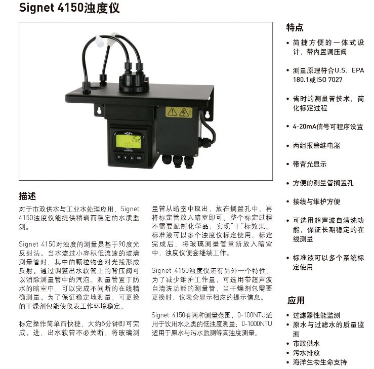 進(jìn)口濁度儀4150還配有干燥劑更換提示、玻璃自動(dòng)清洗功能,以便于維護(hù)。進(jìn)口濁度儀4150有兩種量程可選。0 -100 NTU 型的用于低量程應(yīng)用,如飲用水監(jiān)測(cè)。0 - 000 NTU 型的可用于各種場(chǎng)合,如原水、廢水等。