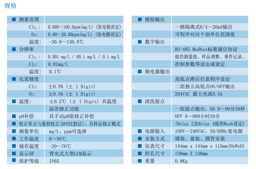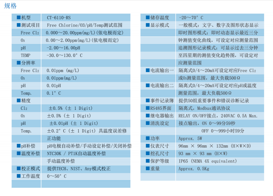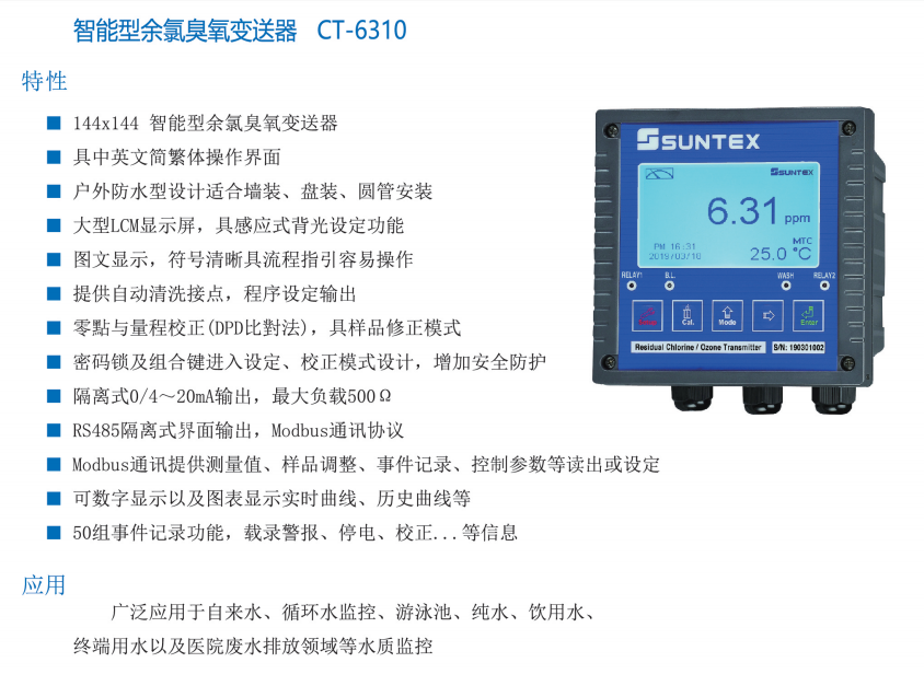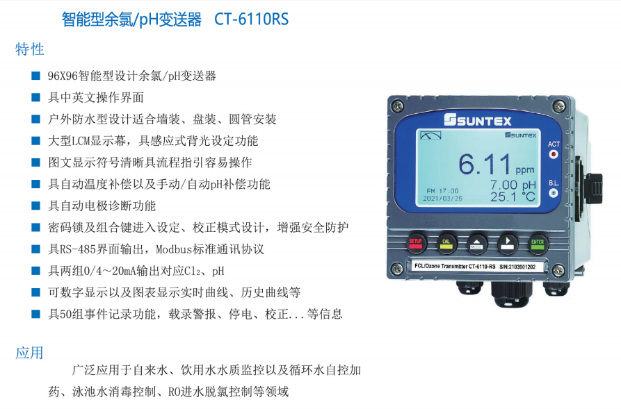 上泰SUNTEX智能型余氯臭氧PH變送儀器CT-6310/6110RS儀表電極配套