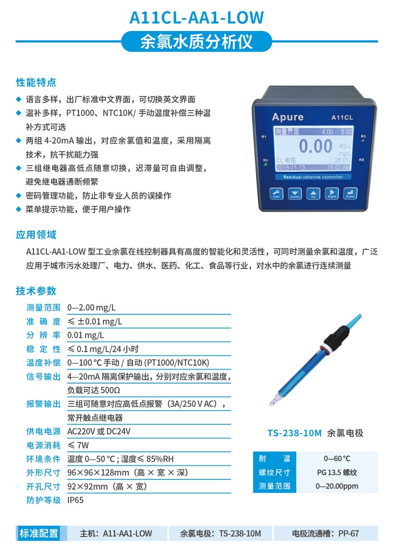 Apure余氯儀A10/A11/A20CL工業(yè)余氯在線控制器數(shù)顯臺式余氯測試儀