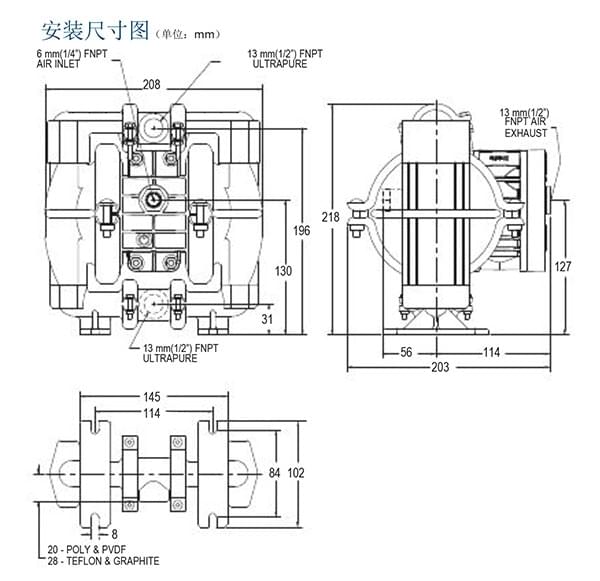 • 可通過選用泵體的外殼及隔膜的材質來輸送不同特性的強酸、強堿、強有機溶劑液體介質