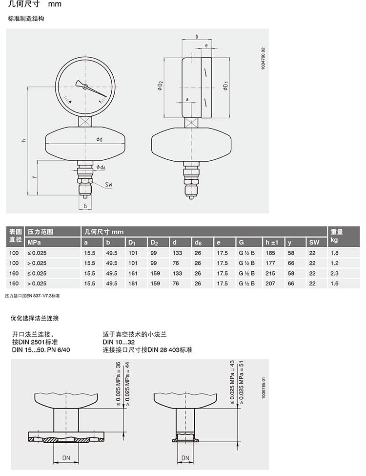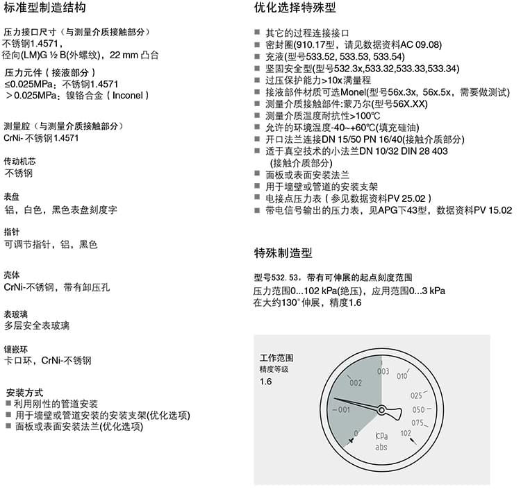 2. 膜片壓力表,化學(xué)工業(yè)型,表頭不充液/充液,高過(guò)壓保護(hù)壓力表,針對(duì)UHP應(yīng)用:422.12 432.50 432.56 423.36 423.25