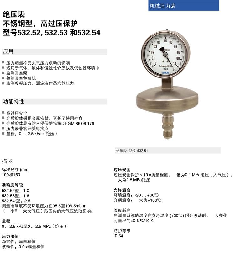 3. 絕壓表,帶有膜片,CrNi-不銹鋼制造結(jié)構(gòu)壓力表:516.11 516.12 532.51 532 .52 532.53 532.54
