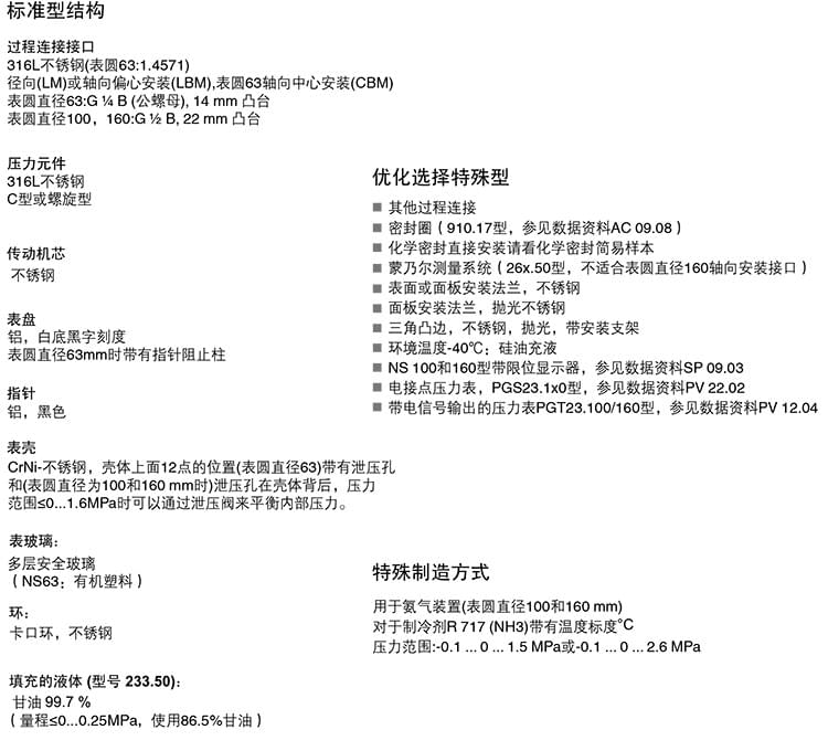 2. 膜片壓力表,化學工業(yè)型,表頭不充液/充液,高過壓保護壓力表,針對UHP應(yīng)用:422.12 432.50 432.56 423.36 423.25