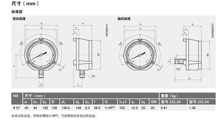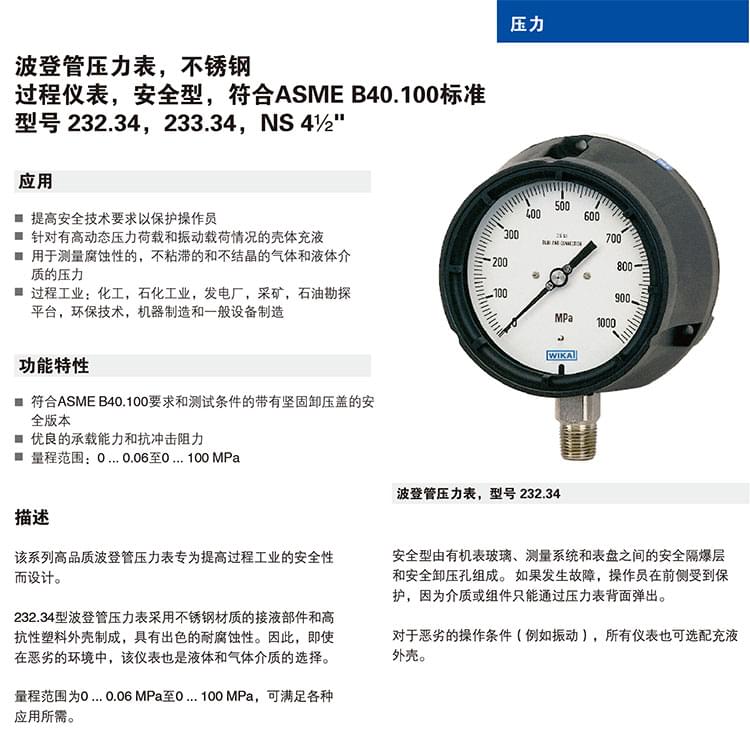232.34,233.34型不銹鋼波登管壓力表