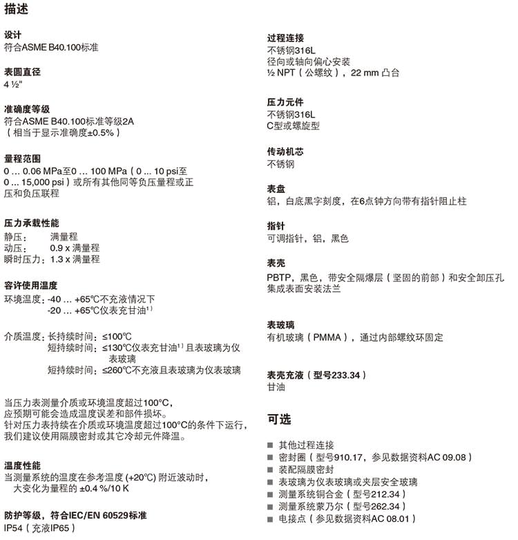 2. 膜片壓力表,化學工業(yè)型,表頭不充液/充液,高過壓保護壓力表,針對UHP應(yīng)用:422.12 432.50 432.56 423.36 423.25