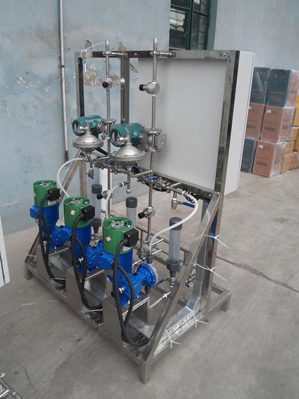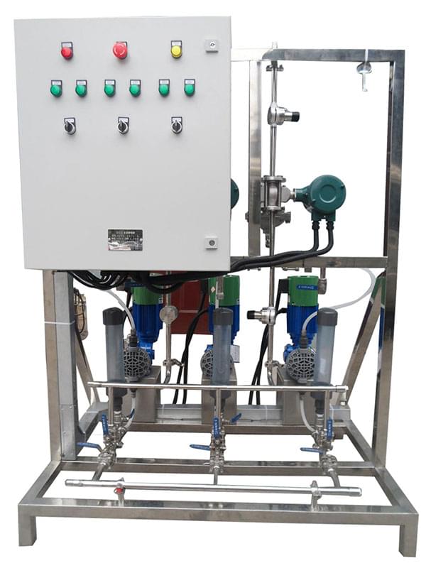 配置:該加藥裝置由計(jì)量泵、控制系統(tǒng)、流量計(jì)、變頻器、標(biāo)定柱、背壓閥、安全閥和不銹鋼管道組成。