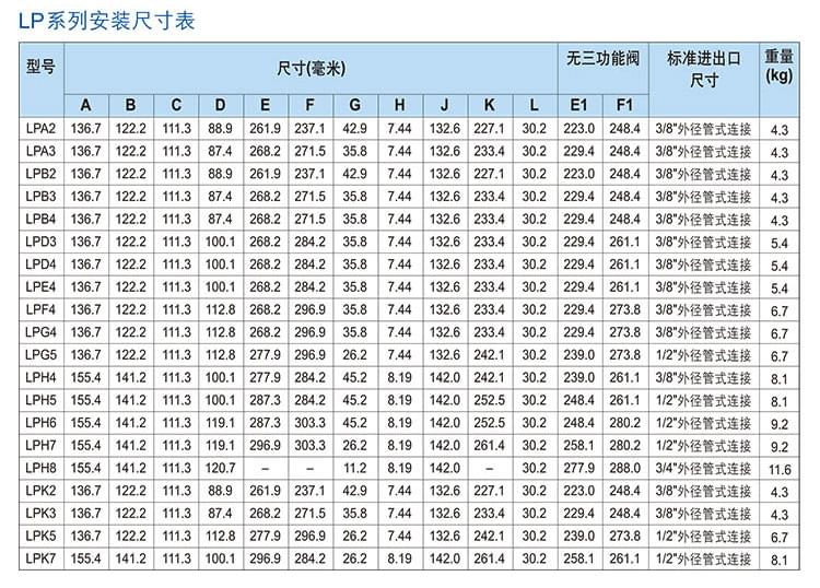 1/4"內(nèi)徑×3/8"外徑,3/8"內(nèi)徑×1/2"外徑,3/16"內(nèi)徑×5/16"外徑,1/2"內(nèi)徑×3/4"外徑(只用于LPH8)