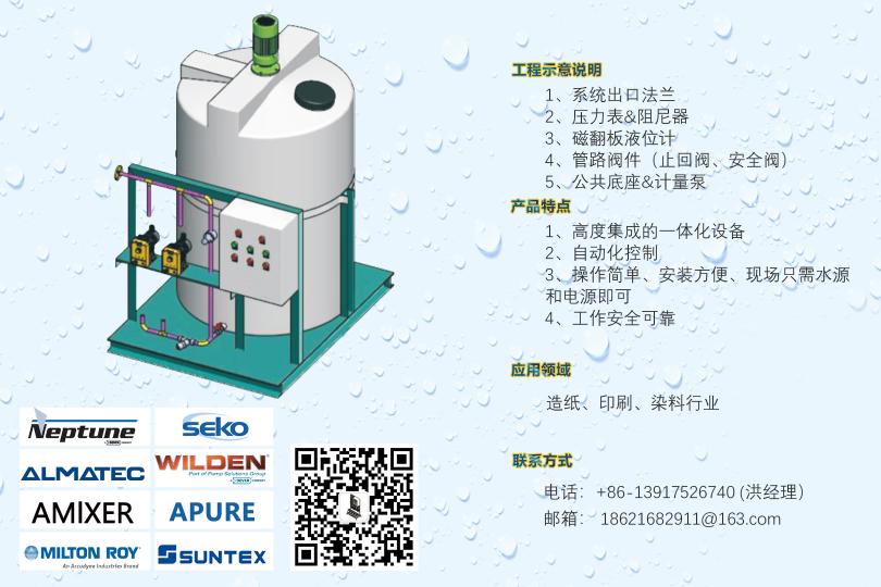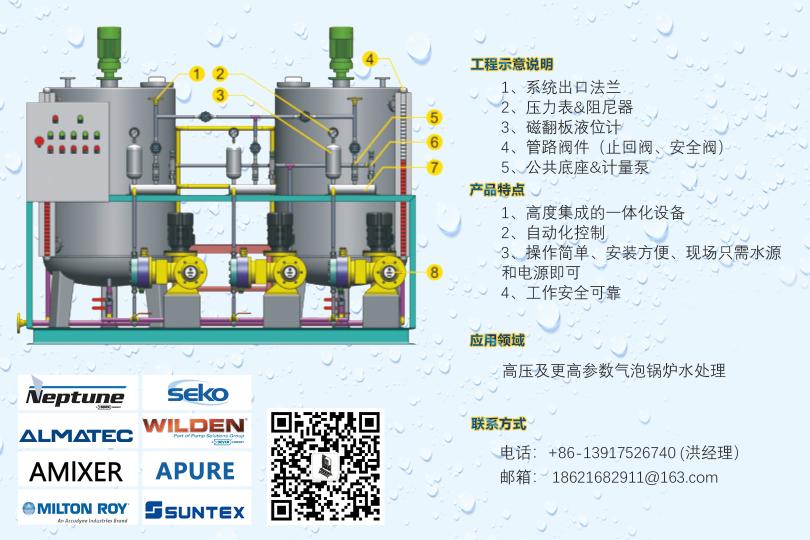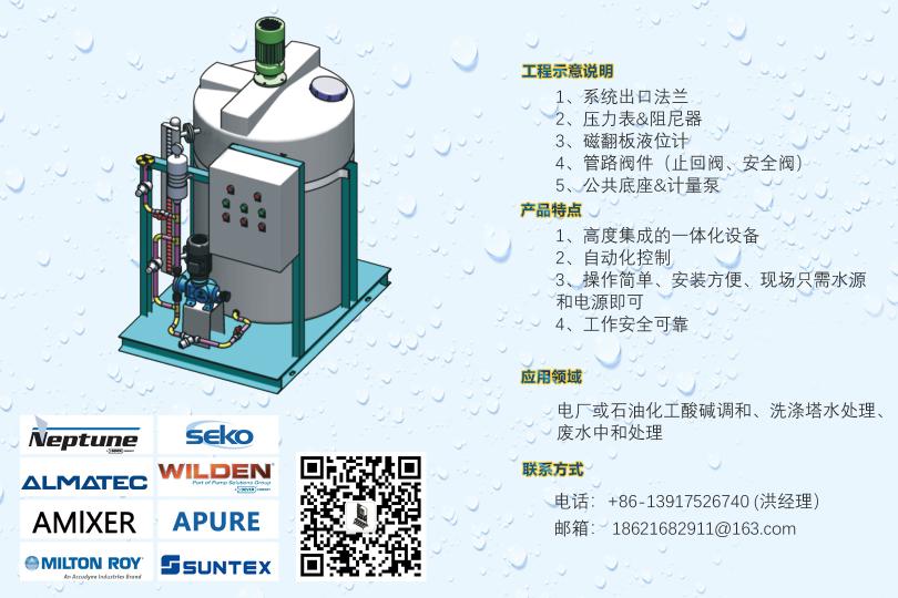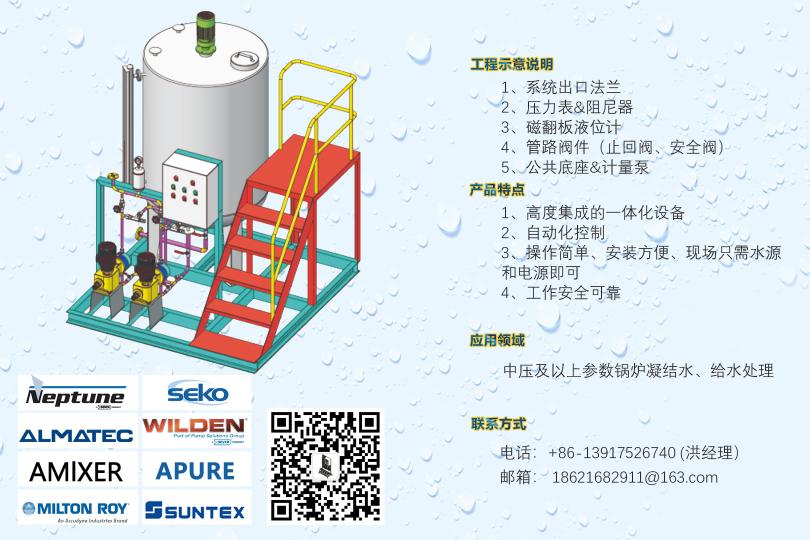 循環(huán)水加藥裝置,示蹤劑加藥裝置,遠(yuǎn)程控制DCS加藥裝置,PAC加藥裝置,PAM加藥裝置,酸堿中和加藥裝置,冷卻塔加藥裝置,干粉投加裝置,高分子自動泡藥機(jī),PAM自動制備系統(tǒng),絮凝劑制備系統(tǒng),PAC自動溶解混合配制裝置,純水反滲透裝置,軟化水系統(tǒng),過濾系統(tǒng),遠(yuǎn)程控制系統(tǒng),安全閥,背壓閥,流量校正柱,管道式流量計等。