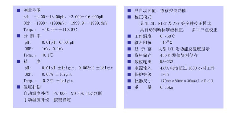 防水、外觀輕巧、攜帶方便,具自動溫度補償功能;大型LCD屏幕,方便讀取測值。具備多種自動校正功能與低耗電特性,適合野外量測或現(xiàn)場制程及廢水處理等量測。